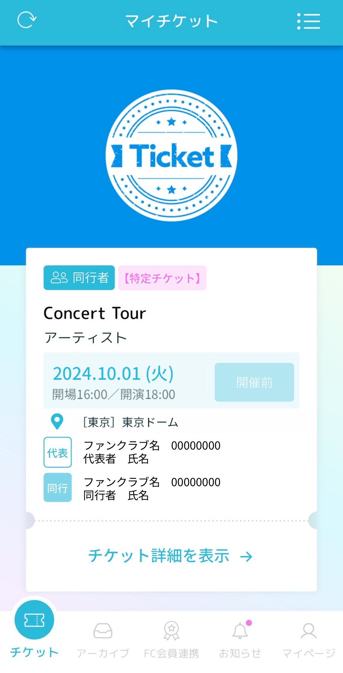 公演チケットはアプリ連携をいただいたお申込み代表者様・同行者様の端末にそれぞれ表示されます。