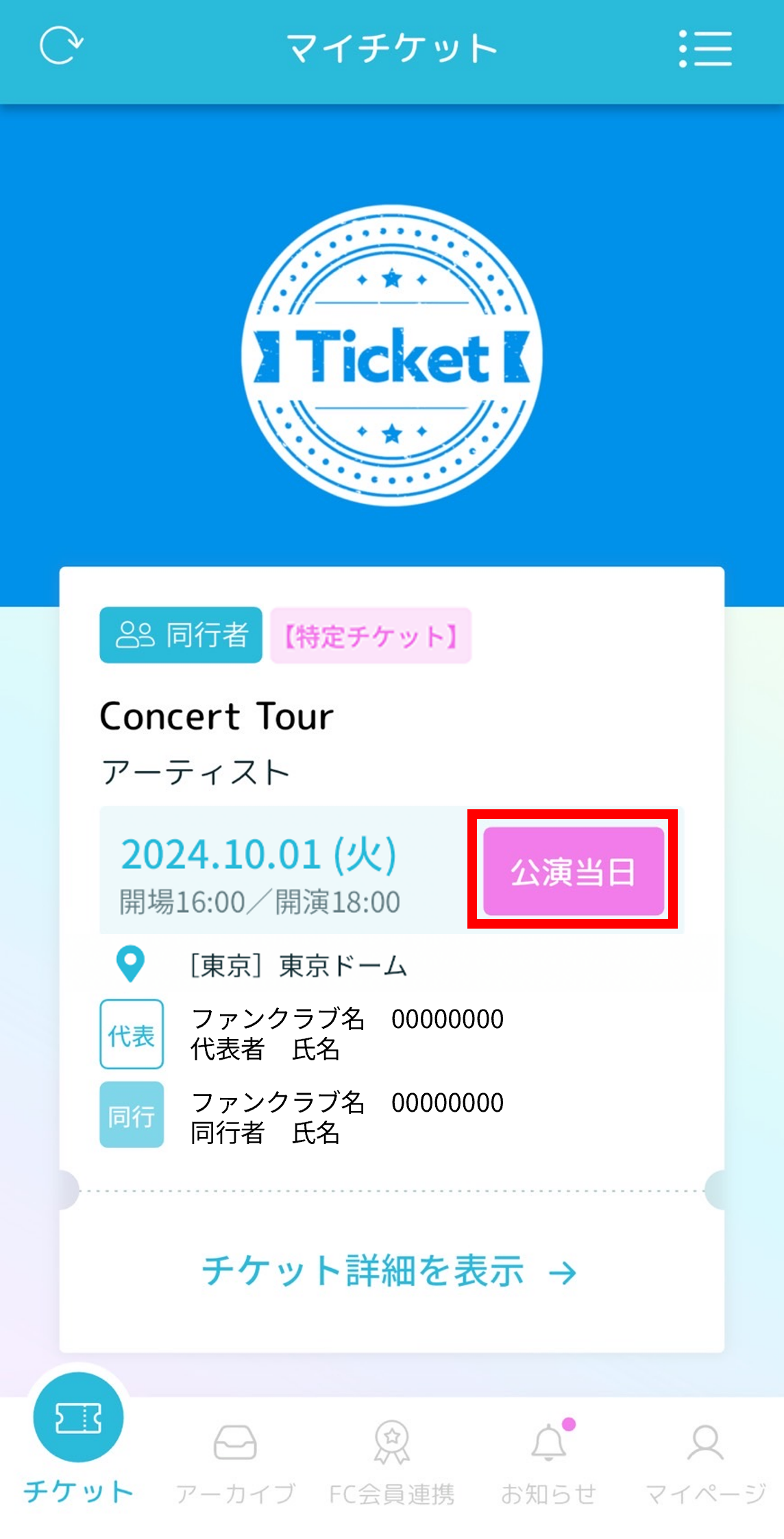 公演当日は、チケット詳細画面の表示が[公演当日]となります。